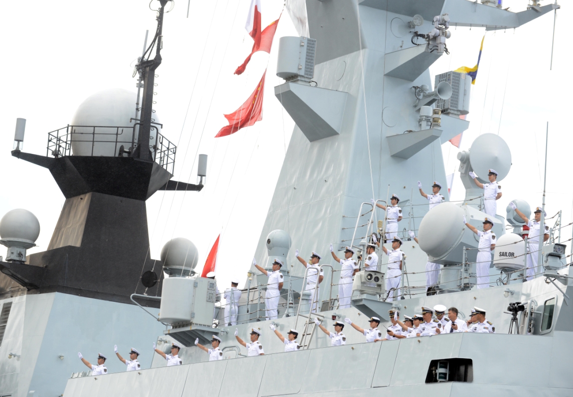 护卫舰「烟台號」官兵向人群致军礼。记者 崔俊良摄