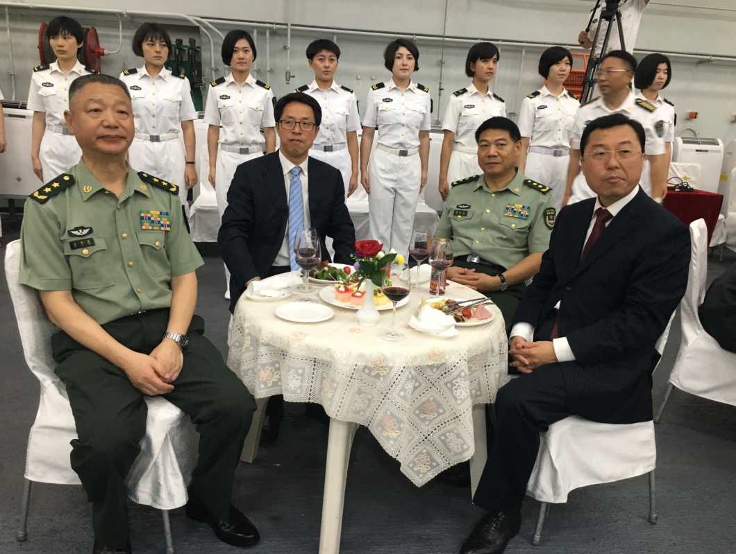 「遼寧號」及其屬艦昨日起泊港5日,一眾高官及政商界人士獲邀出席了傍晚的晚宴及招待會,董建華、何厚鏵、梁振英(攜同太太及女兒頌昕)、林鄭月娥、張曉明出席外,另有中聯辦主任副主任殷曉靜及陳冬、全國人大常委范徐麗泰、港區人大代表劉佩瓊、警務處處長盧偉聰、消防處處長李建日、香港友好協進會會長戴德豐等等多人。