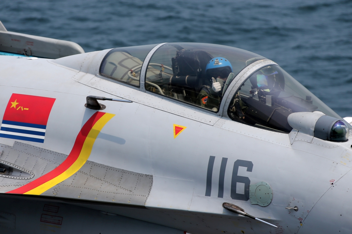 歼15舰载战斗机飞行员示意准备完毕,可以起飞。