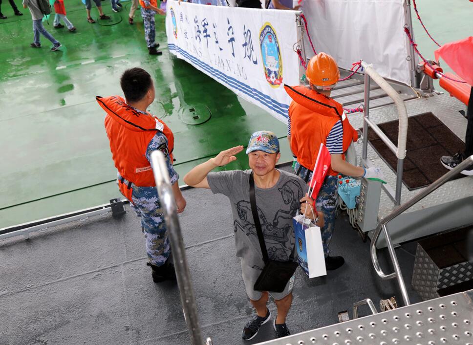 第一位登上遼寧艦的市民向官兵敬礼。中新社