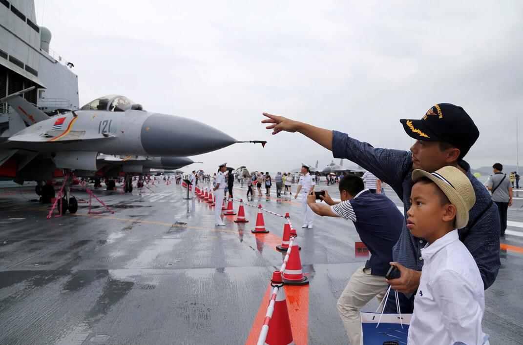 父亲在給兒子介绍艦載戰鬥機。 中新社