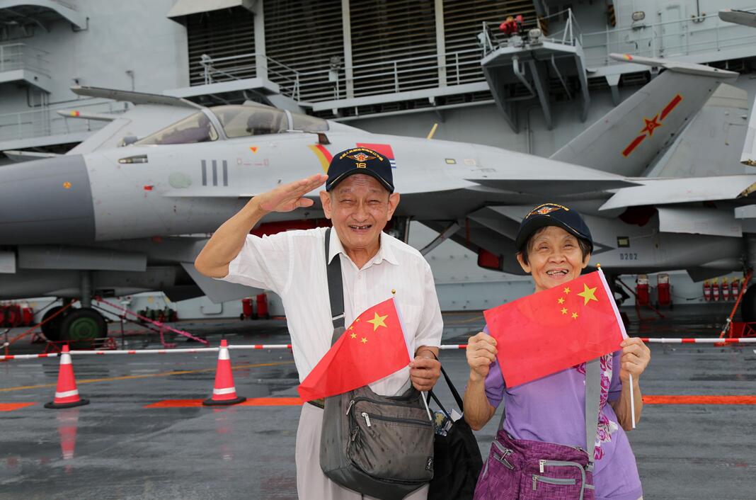 印尼華僑夫婦在遼寧艦飛行甲板揮舞國旗敬禮。 中新社