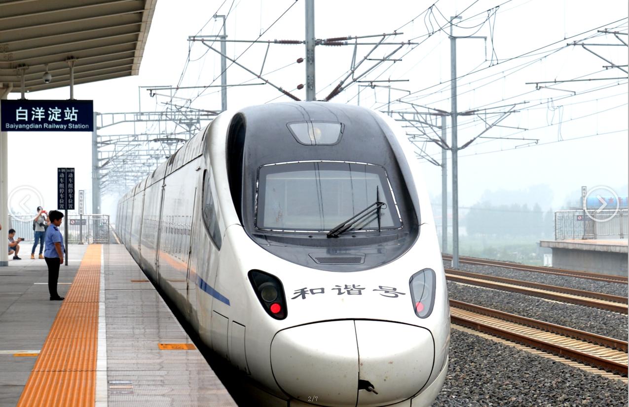 北京至雄安新区首次开行动车组列车,动车驶出白洋淀站。新华社