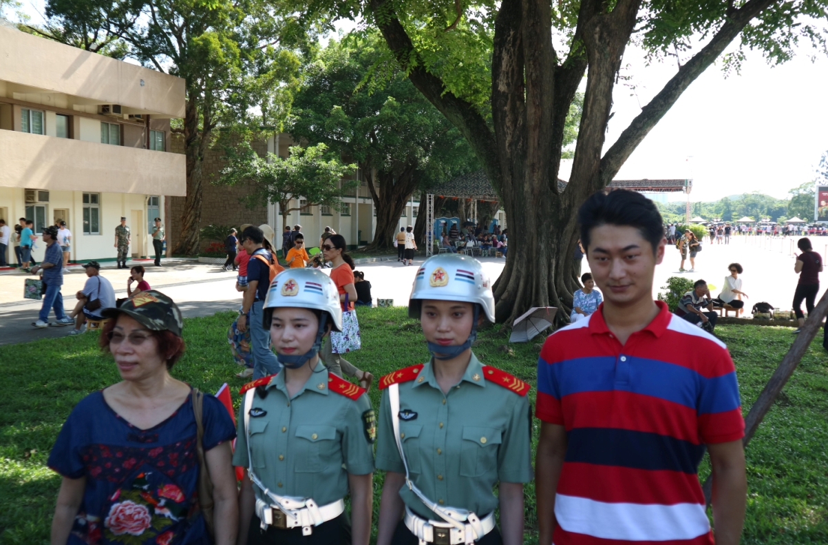 適逢昨日是假期,不少家長特意帶同子女前來參觀新圍軍營開放日,炎熱天氣加上市民的熱情,頓時令軍營變得更為熱鬧,有進場參觀的長者急不及待與士兵合照留念。當場內廣播指稍后將有演練時,市民均擁到場邊,務求占得較佳位置,拍攝和捕捉士兵步操最威武的一刻。