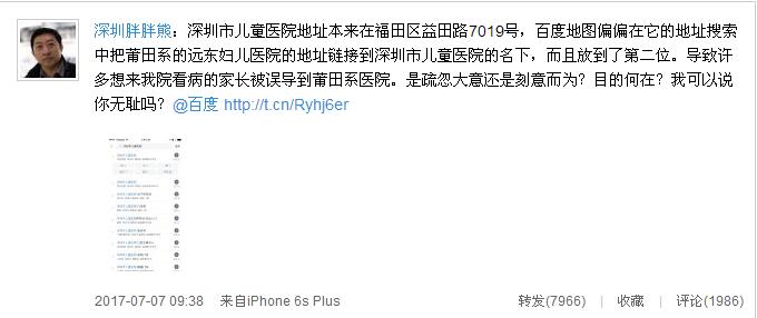 微博簡介為深圳市兒童醫院小兒外科醫生的@深圳胖胖熊近日在微博上曬出了兩張百度地圖的搜索結果,稱在百度地圖搜索深圳市兒童醫院,搜索結果卻將莆田系的遠東婦兒醫院的地址鏈接到了深圳市兒童醫院的名下,而且放到了第二位,導致許多想來深圳市兒童醫院看病的家長被誤導到莆田系醫院。並質疑稱“是疏忽大意還是刻意而為?目的何在?”