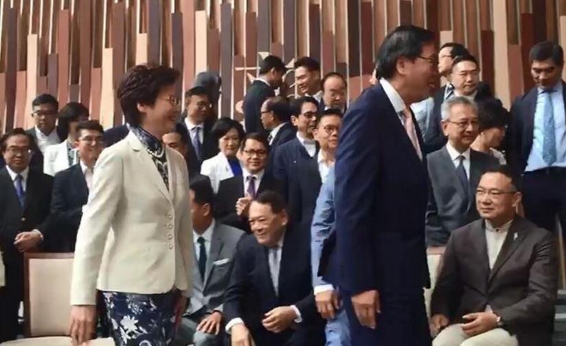 一眾出席議員和行政長官林鄭月娥先在立法會地下大堂合照。大合照後,林鄭月娥由立法會主席梁君彥陪同下先到宴會廳。