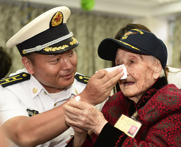 趙金路中校為110歲的女人瑞謝月瓊擦乾眼泪。中新社