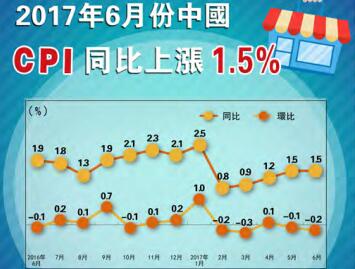 【香港商報網訊】國家統計局昨日發布的2017年6月份全國居民消費價格指數(CPI)和工業生產者出廠價格指數(PPI)數據顯示,CPI環比下降0.2%,同比上漲1.5%;PPI環比下降0.2%,同比上漲5.5%。專家表示,從價格走勢來看,下半年中國經濟企穩向好態勢將更為明顯。