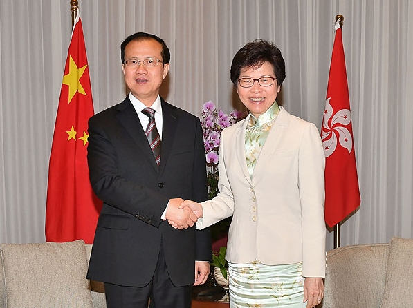行政长官林郑月娥(右)与国家商务部国际贸易谈判代表傅自应会面。