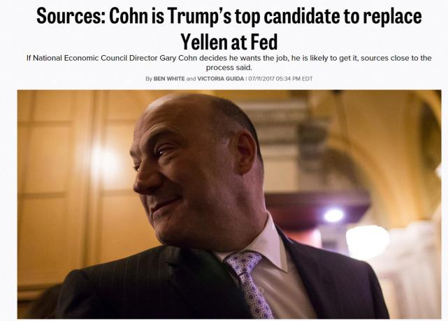 據美國政治新聞網站Politico消息,4位知情人士透露,耶倫明年很可能不再連任美聯儲主席。而前高盛(Goldman Sachs)總裁、白宮經濟委員會主席加裏-科恩(Gary Cohn)成為接替耶倫的熱門候選人。