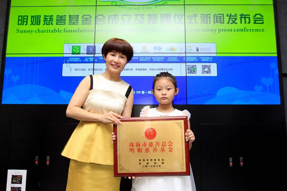 12日上午,“明媚基金”发起人欧阳明媚从珠海市慈善总会秘书长雷霄手中接过“明媚慈善基金”授牌,标志着珠海发起人年龄最小的一家慈善冠名基金正式成立。明媚基金将重点关注脑瘫儿童和儿童大病医疗保障,帮扶贫困儿童脱离病痛的折磨,享受本应属于他们的美好童年。