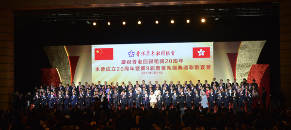 【香港商報網訊】記者曾美玲報道:香港廣東社團總會昨日假香港會議展覽中心新翼三樓大會堂隆重舉行「慶祝香港回歸祖國20周年 本會成立20周年暨第9屆會董就職典禮聯歡宴會」,梁亮勝榮膺新一屆主席。全國政協副主席董建華,行政長官林鄭月娥,中聯辦主任張曉明、副主任林武,廣東省政協主席王榮,外交部駐港特派員謝鋒,解放軍駐港部隊司令員譚本宏、政委岳世鑫,廣東省委常委、統戰部部長嚴植嬋,全國政協港澳台僑委員會副主任吳國禎,中國僑聯副主席李卓彬,政務司司長張建宗,立法會主席梁君彥等應邀主禮,逾2000人共聚盛會,場面盛大,氣氛熱烈。