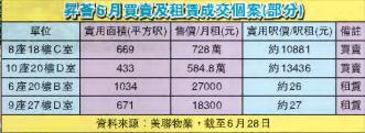 張少勛又強調,有見缺盤,業主叫價十分硬淨,當中不乏是零議價成交,例如該行日前促售的10座中層C室1房單位,實用面積445平方呎,業主最初叫價558萬元,最後就以558萬元易手(連租約),實用呎價約12539元。至於租賃個案方面,6座20樓B室,3房單位,實用面積1034平方呎,早前以27000元月租租出,實用呎租約26元,由於3房租盤不多,樓層對價格影響較大,部分高層單位月租可達35000元。