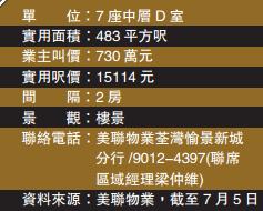是次走訪單位,位於「環宇海灣」7座中層D室,2房間隔,實用面積約483尺,業主目前住於單位,正委託代理帶裝放售。單位叫價約730萬元(截至7月5日),折合實用尺價約15114元,屬於屋苑一般尺價水平。