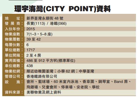「環宇海灣」位於荃灣永順街48號,為長實(1113)及港鐵(066)合作發展的私人屋苑,2015年入伙。屋苑由7座樓高39至42層的物業所組成,合共提供1717個單位,實用面積約486至912平方尺,戶型覆蓋2至4房。