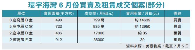 美聯物業荃灣愉景新城分行聯席區域經理梁仲維表示,「環宇海灣」2房叫價由680萬元至850萬元,放盤量約30個。上月份(6月)買賣成交個案有9宗,租賃有16宗。業主心態進取,議價空間只有約3%至5%,而買家主要為換樓客。