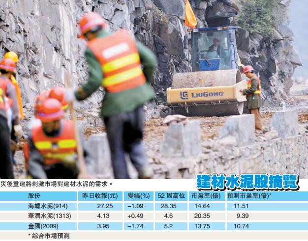 各受災區災后重建,將要重新鋪設道路、建造樓房,從投資市場的角度看,這勢必刺激市場對建材水泥的需求,建材水泥股近日也持續向上,惟昨日就略為回落,海螺水泥(914)、金隅(2009)分別跌1.09%、1.74%。