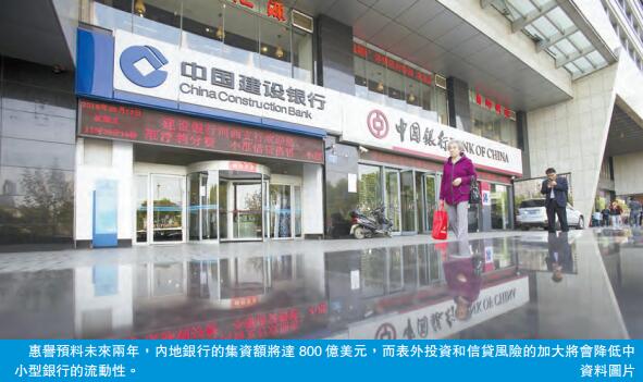 【香港商報网訊】實習記者王韻琪報道:惠譽評級高級董事兼中國銀行業評級主管胡月明昨出席記者會時指出,內地暫時還未進入去槓桿周期,正面對經濟增長與銀行系統風險的兩難局面。和大型國有銀行相比,由於內地中小型銀行的資金來源更依賴信用貸款,因此會面對息差續受壓的問題。她預料未來兩年,內地銀行的集資額將達800億美元,而表外投資和信貸風險的加大將會降低中小型銀行的流動性。