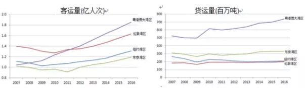 图 2007-2016年各大湾区航空客货吞吐量对比(亿人次,百万吨)