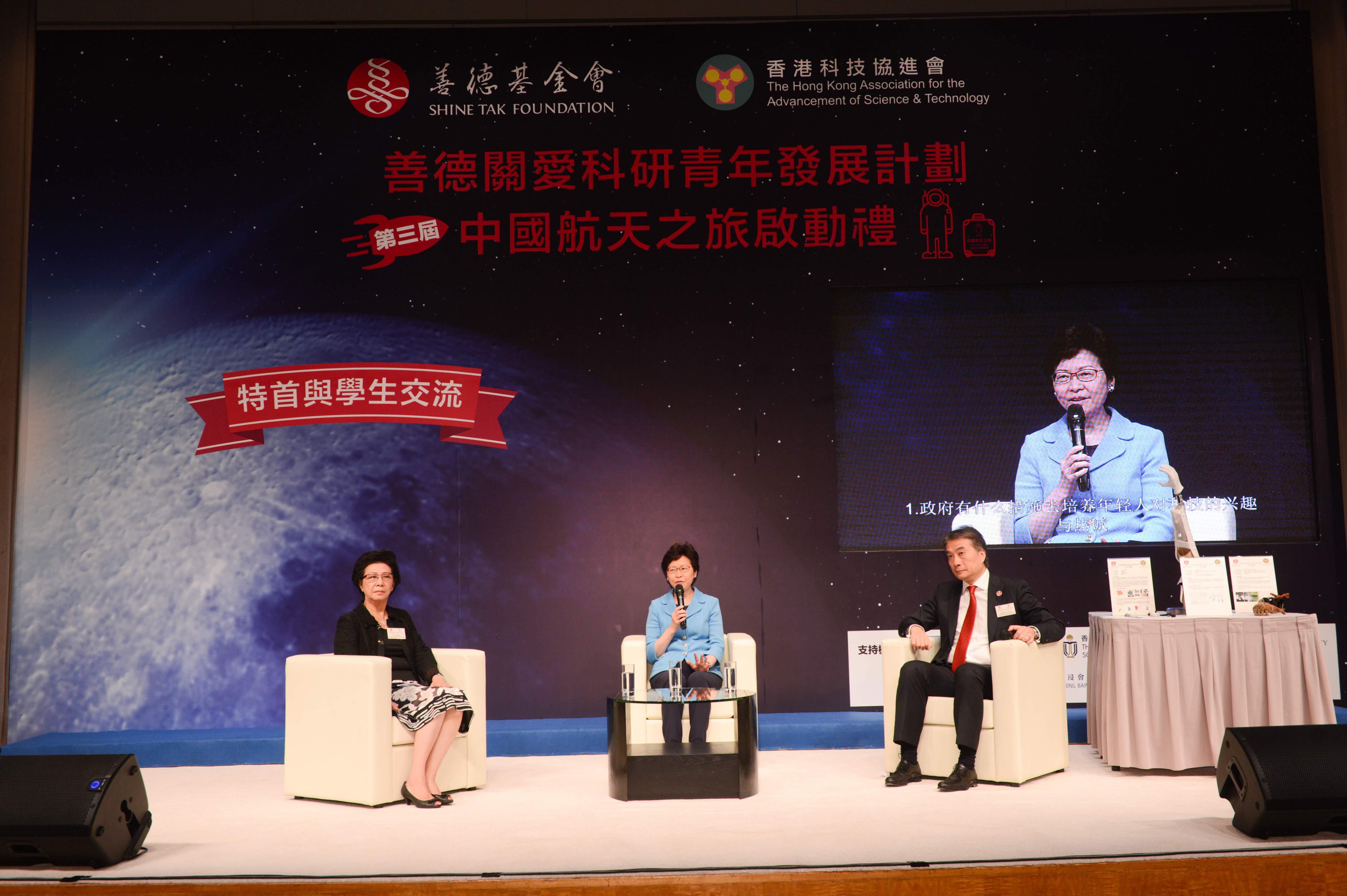 林鄭致辭時說,航天科技將帶領國家在天文、物理生物科學各方面繼續進步,特別鼓勵同學須增加在航天科技和其他相關科學範疇的興趣,同時努力裝備自己、務求一展所長,造福社會。