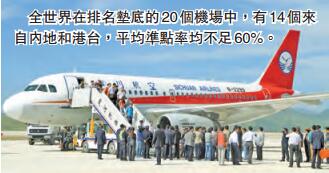 至於倒數第二的機場則是杭州(準點率40.58%)、倒數第三是南京(準點率44.65%)、倒數第四是上海浦東(準點率51.62%)、倒數第五是深圳(準點率51.62%)。而全世界在排名墊底的20個機場中,更有14個來自內地港台,平均準點率均不足60%。