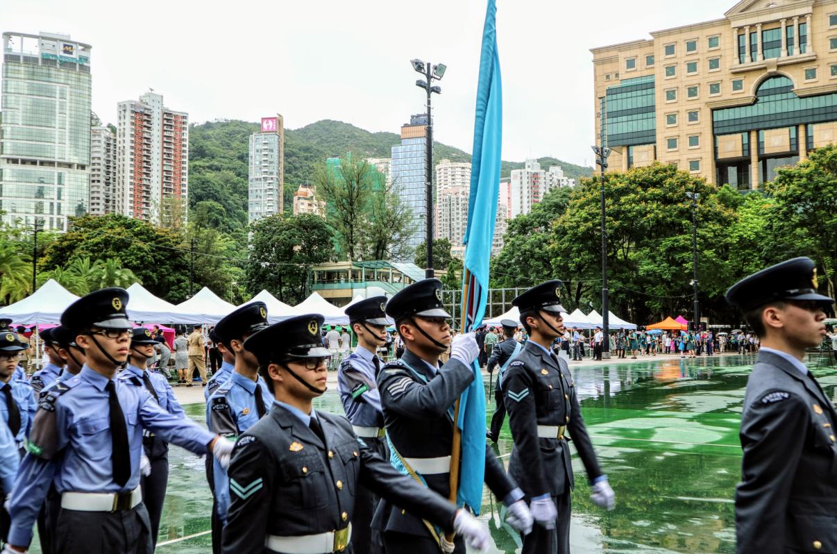 香港航空青少年总会队员于雨中步操。實習記者 葉柏希摄