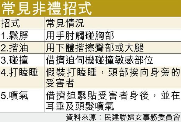 搭港鐵遇上好色之徒被「鹹豬手」怎麼辦?有調查發現,35%受訪女性曾在港鐵內遭人非禮或企圖非禮,46名受訪男性亦有同樣遭遇,但多數人沒報警求助,主要因難以舉證及怕尷尬。負責調查的團體呼籲增設女性專用車廂,以減少非禮事件及不必要的誤會。