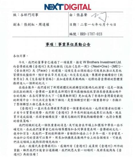 大約在昨日早上10時,壹傳媒及《壹週刊》高層先舉行內部會議,后來壹傳媒行政總裁張嘉聲在員工大會上正式宣布,公司已接納潛在買方黃浩旗下W Bros. Investments Limited的指示性要約,以展開正式協議磋商,內容關於可能出售壹傳媒於《壹週刊》、《忽然1周》、《FACE》(包括前身《壹本便利》)、《ME!》及《Next+One》的香港及臺灣業務權益。