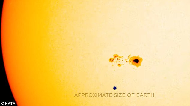 NASA太陽動力天文台於上周首次觀察到這塊巨大的太陽黑子,一直到本周仍未消除。太陽黑子是太陽表面亮度較暗、溫度較低的區域,由太陽磁場所引起。它們通常出現在磁場活動密集的區域,當其釋放能量時,太陽耀斑和劇烈的太陽風暴便會從太陽黑子中傾瀉而出。
