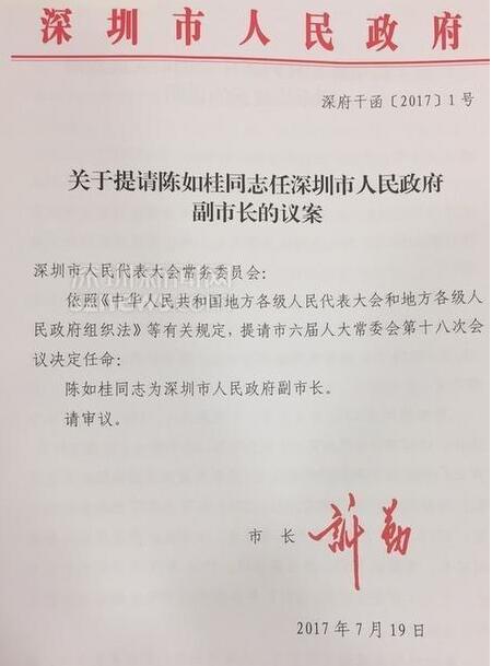 【香港商报网讯】据深圳特区报消息,7月20日上午,深圳市六屆人大常委會舉行第十八次會議,任命陳如桂為深圳市人民政府副市長、代理市長。近日,經省委批準,陳如桂任中共深圳市委委員、常委、副書記。