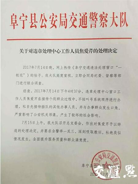 此段視頻被曝光后,7月15日上午,阜寧縣公安局交警大隊發布《關于對違章處理中心工作人員焦愛芹的處理決定》。