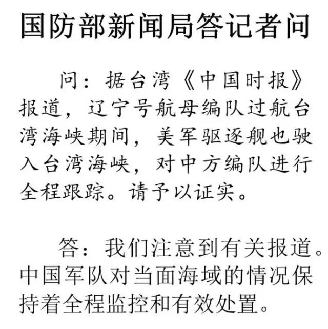 在今日举行的国防部新闻发布会上,有记者提问:據台灣《中國時報》報道,遼寧號航母編隊過航台灣海峽期間,美軍驅逐艦也駛入台灣海峽,對中方編隊進行全程跟蹤。請予以證實。