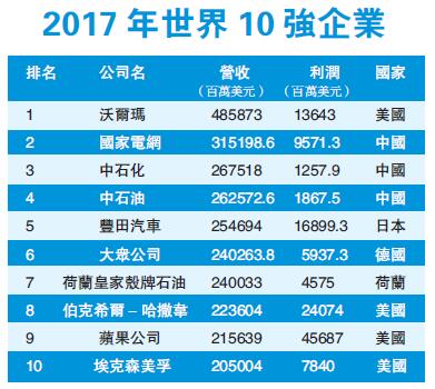 沃爾瑪連續四年排名第一位,2016年營業收入達4,858.7億美元,同比提升0.8%。前三陣營中的其它兩家為中國公司--國家電網和中石化。中石油和豐田汽車分列第四和第五。唯一新進入前十陣營的是沃倫巴菲特掌管的保險和投資集團伯克希爾-哈撒韋公司。中國上榜公司數量連續第十四年增長,今年達到了115家。
