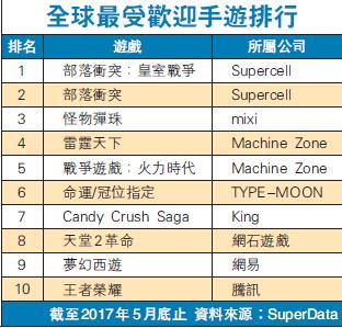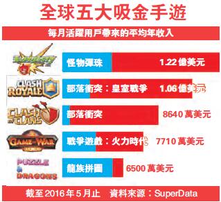另一方面,手遊收入貢獻內地文化產業市場比重越來越高,惟全球五大吸金手遊當中,若不計騰訊早前收購的Supercell,內地手遊吸金力五甲不入,在內地風頭一時無兩的《王者榮耀》沒有上榜,反而收入最高的是人口遠比中國少的日本。