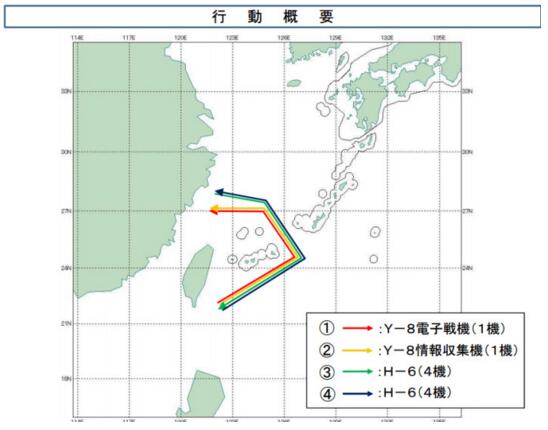 日本防衛省統合幕僚監部提供的資料顯示,4架H-6轟炸機、1架“運八”電子戰機、1架“運八”情報搜集機從南向北,然后經過宮古海峽向西飛往中國大陸;另外4架H-6轟炸機則從北從西向東,然后經過宮古海峽向南再向西飛往中國大陸,飛行路線均環繞中國台灣島。
