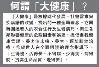 「大健康」是根據時代發展、社會需求與疾病譜的改變,提出的一種全局理念。它同時圍繞着人的衣食住行及生老病死,關注各類影響健康的危險因素和誤區,提倡自我健康管理、養老治未病、養生、預防勝於治療,