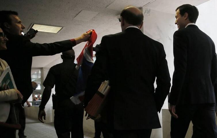 在現場,一名示威者Ryan Clayton手持俄羅斯國旗,試圖將旗幟拋向美國白宮高級顧問庫什納的面前。