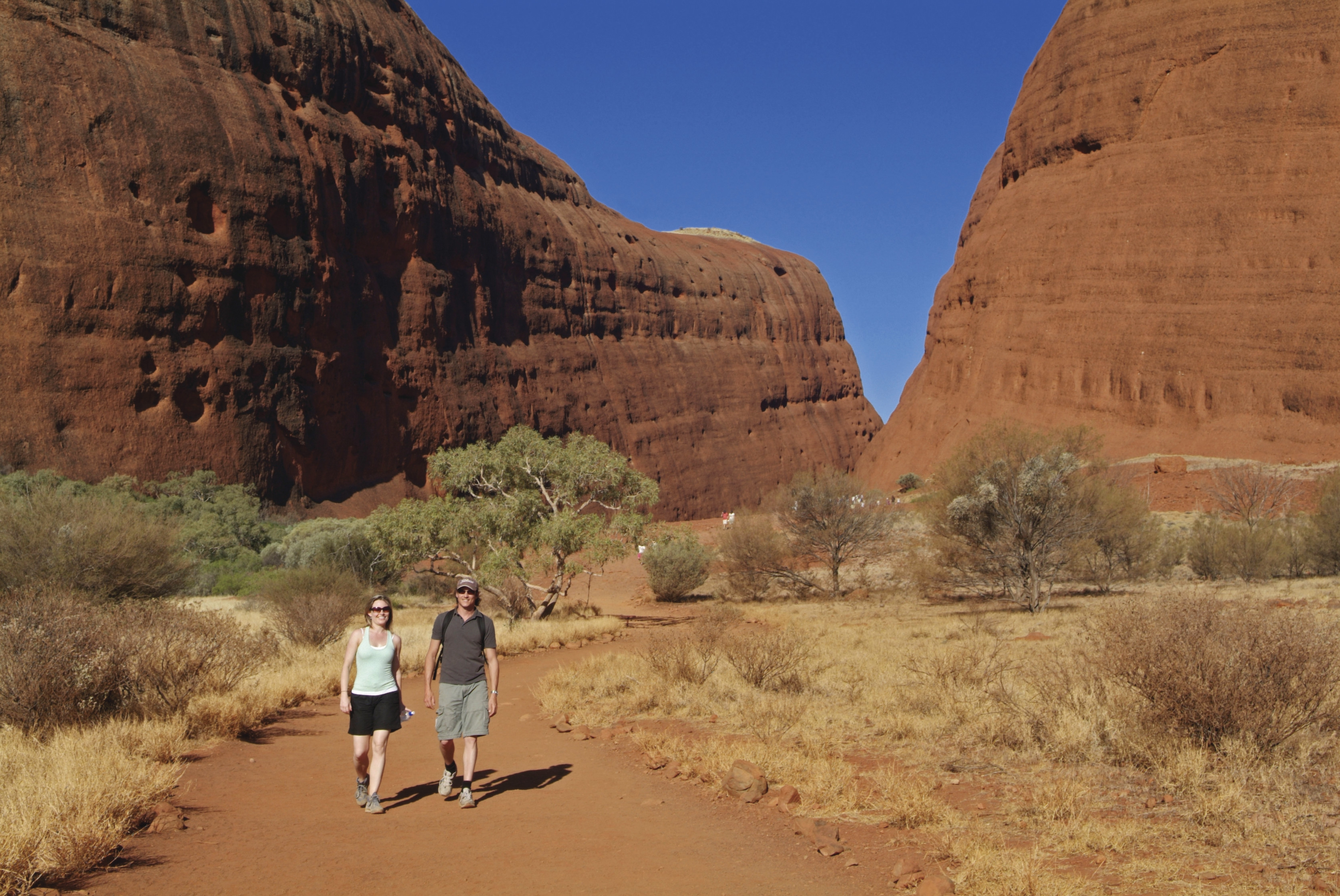 相對烏魯魯是單一岩石塊,卡塔丘塔猶如被砍開了36塊的岩石般,散布在公園一隅。由於風之谷路程迂迴曲折,沿途沒有任何木板、扶手,甚至連路標也寥寥無幾,若遊客稍一不留神便容易迷路。不過,因聲音被圓頂包圍形成強烈迴響效果,能將遊客此起彼落的叫聲、歡笑聲,化成一首交響樂,提醒大家前路方向。征服風之谷後,筆者前往文化中心購買原住民親做小手信,以紀念這難忘旅程。