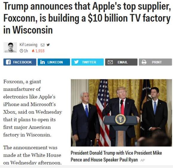 富士康在一份聲明中稱,這筆投資標志著富士康未來幾年對美國制造業實施一系列投資的開始。 特朗普此前披露,蘋果公司CEO蒂姆·庫克(Tim Cook)已經向他承諾,將為美國帶來三座大型制造工廠。