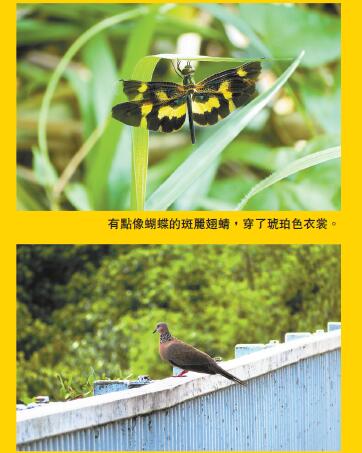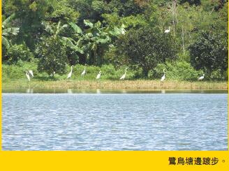 在烈日下走一小時,打着傘仍汗流浹背,但暫停運作的魚塘,其風光仍很美麗,大群白鷺在塘邊踱步或在樹上休息;夏天活躍於濕地的斑麗翅蜻,陪你走,琥珀色的身軀在陽光中耀眼非常;睡蓮浮葉點綴塘水,蓮花將開未開,而多色野花盛放,魚塘像圍了一條彩帶;最注目的,是魚塘處處都有山巒、藍天及白雲的倒影,這種天空之鏡的景致遊人不須往他處尋。