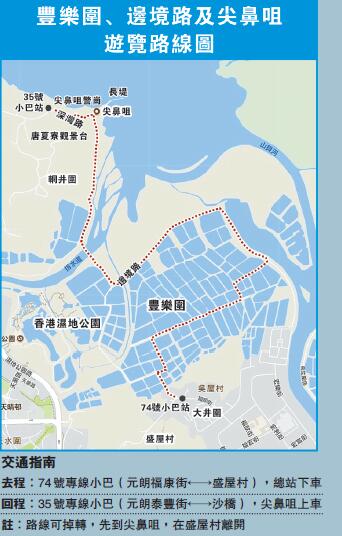 豐樂圍的魚塘很大,遊人一般會選擇靠近香港濕地公園的泥路到邊境路,這一條路線九成以上路段不在豐樂圍發展項目範圍內,亦較快到達目的地。不過,記者選擇穿過發展商須要保育的魚塘地段到邊境路,這條路線較長,沿着容許車輛通過的堤圍走,邊走邊賞,不經不覺走了一小時。