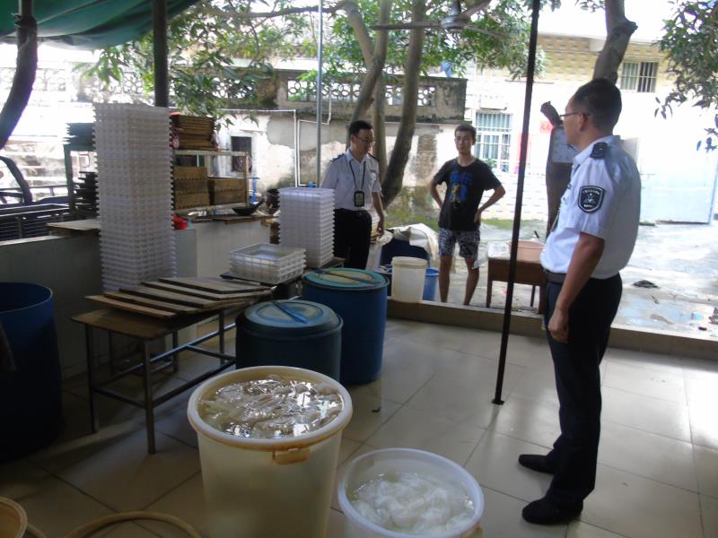 據了解,執法人員經過檢查發現,該豆腐加工窩點所在的圍角老屋,地處深圳與惠州交界處,周邊環境較為僻蔽。當事人在院牆內搭建一處簡易棚子進行加工制作白豆腐,在加工棚內可見擺放有攪拌、煮制、冷卻、分裝等加工設施設備,各工藝流程之間未作任何隔斷。另在一破舊的老房內放置一台炸鍋,用於加工制作油豆腐,該處存放有原料大豆6包約330公斤,加工場所未設置防鼠、防塵、防蠅等“三防”措施,環境衛生惡劣。執法人員當場查封扣押了用於違法經營的工具、設備、食品原料等一批,並對當事人進行立案調查。