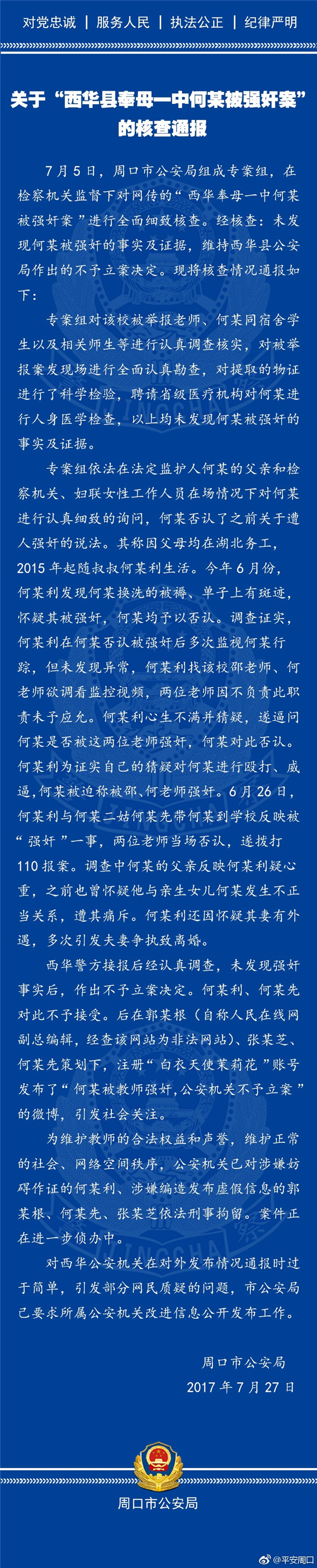 河南省周口市公安局官方微博@平安周口 7月27日發布情況通報,通報稱,7月5日,周口市公安局組成專案組,在檢察機關監督下對網上傳播的“西華奉母一中何某被強奸案”進行全面細致核查。經核查:未發現何某被強奸的事實及證據,維持西華縣公安局作出的不予立案決定。