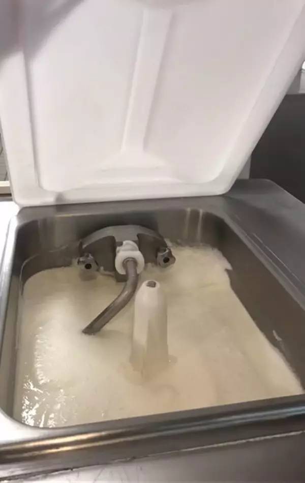按照餐廳部門經理張琪介紹,該冰淇淋制作機與網上曝光的美國機器不同。其冰淇淋制作流程,是工作人員將奶漿倒入機器內部,機器通過內部運轉,做成冰淇淋。奶漿用完后,隨時可以添加。機器每天晚上內部自主加熱到65攝氏度消毒,每14天由專業維保人員打開后進行內部的維護保養和清潔。清潔之前,里面剩余奶漿全部丟棄。