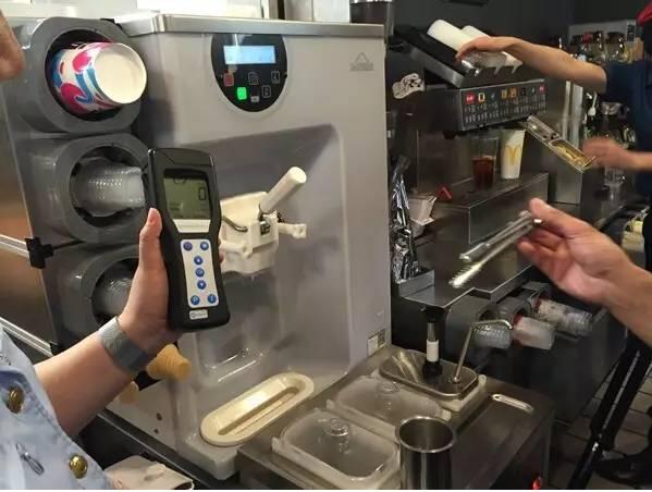 餐廳冰淇淋機器只有一臺,正對前臺。執法人員首先檢查水果夾清潔程度,結果顯示,細菌數為0。