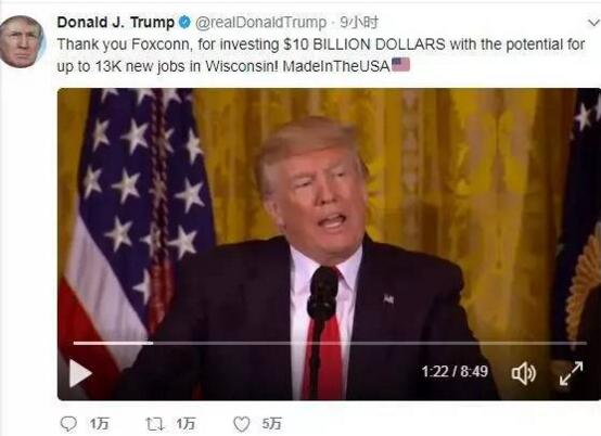 以“推特(Twitter)治國”的特朗普又發話了:"Thank you Foxconn, for investing $10 BILLION DOLLARS with the potential for up to 13K new jobs in Wisconsin! Made In The USA."特朗普更在發布會上稱,如果不是他當選總統,郭台銘不會作出這項投資。