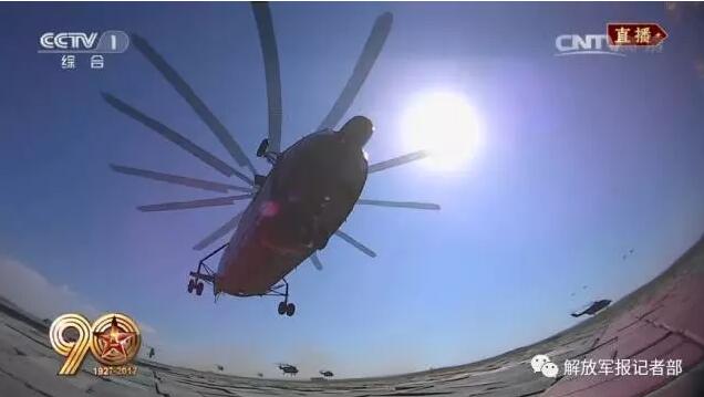 17架直升機組成“八一”標識,24架直升機彙成“90”字樣,象征人民軍隊走過90年光輝曆程。
