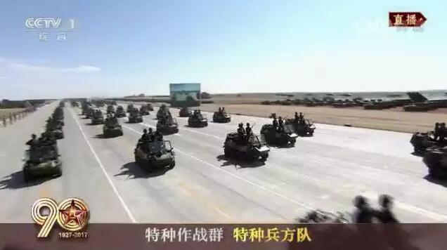威風凜凜的特戰尖兵乘坐全地形車,領隊為張建剛少將。特種作戰是現代戰爭的重要方式。我軍特種兵近年頻繁亮相國際賽場,在強強對抗中展示了中國軍人的高超技能和旺盛鬥志。