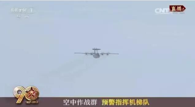 空警-2000預警機、空警-500預警機、運幹-8指通機和運幹-8幹擾機,在8架殲-10B戰機的護衛下,列陣長空,接受檢閱。預警機、指通機等先進裝備的列裝,使我軍預警和作戰指揮控制范圍有效拓展。