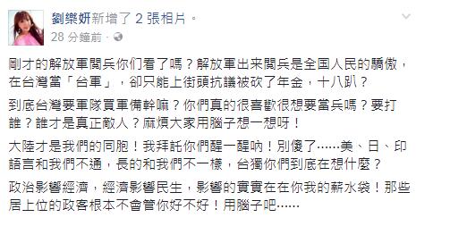 劉樂妍30日在臉書上說,“剛才的解放軍閱兵你們看了嗎?解放軍出來閱兵是全國人民的驕傲,在台灣當‘台軍’,卻只能上街頭抗議被砍了年金,十八趴?”她質問:“到底台灣要軍隊買軍備幹嘛?你們真的很喜歡很想要當兵嗎?要打誰?誰才是真正敵人?麻煩大家用腦子想一想呀!”